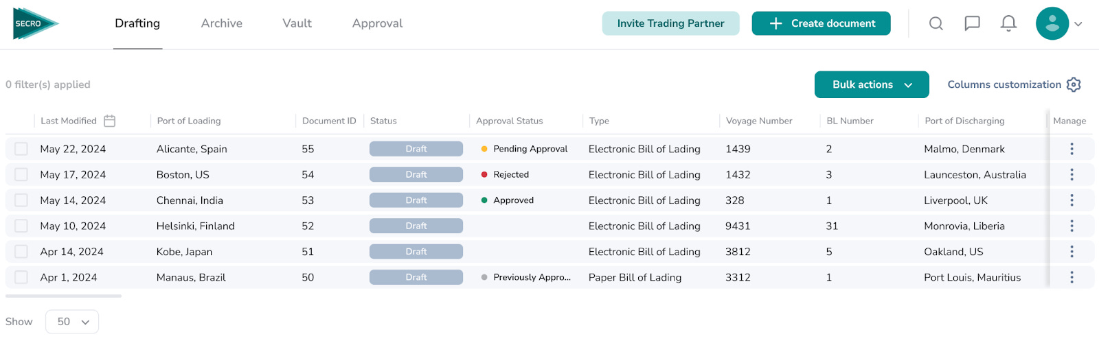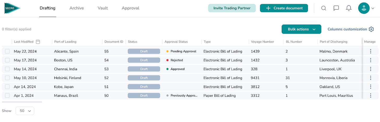 Fig.2. A screenshot of Secro’s user-friendly web portal that provides visibility and core eBL features.